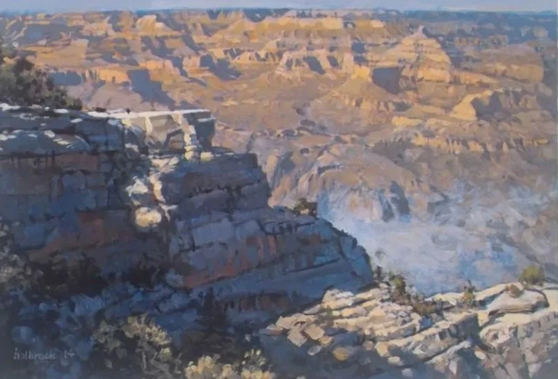 Peter Holbrook’s (1940-2016) landscapes and riverscapes capture mountains, valleys, and bodies of water with intricate detail as seen through his lens. Known for his contemporary landscape paintings of the Southwest as well as California, this selection of small paintings illustrates his strong relationship with the natural world. In an artist statement Peter wrote: "I'm interested in the question of what exactly it is that makes certain places endlessly fascinating to look at. There are no formulas, but scale (large against small) and clarity are often factors. The quality of the secondary (bounced) light that occurs where there are immense polished vertical surfaces to catch it makes some places extraordinary. Rhythmic repetition of shapes gives power and integrity to a composition, so I look for that and often find it in the shadow patterns of erosion (earth and water). I also look for the effects of vast distance on strong color (fire and air). Mostly I just try and be open and receptive to many visual possibilities, and I am often surprised by what shows up. I want the process of painting to surprise and challenge me."